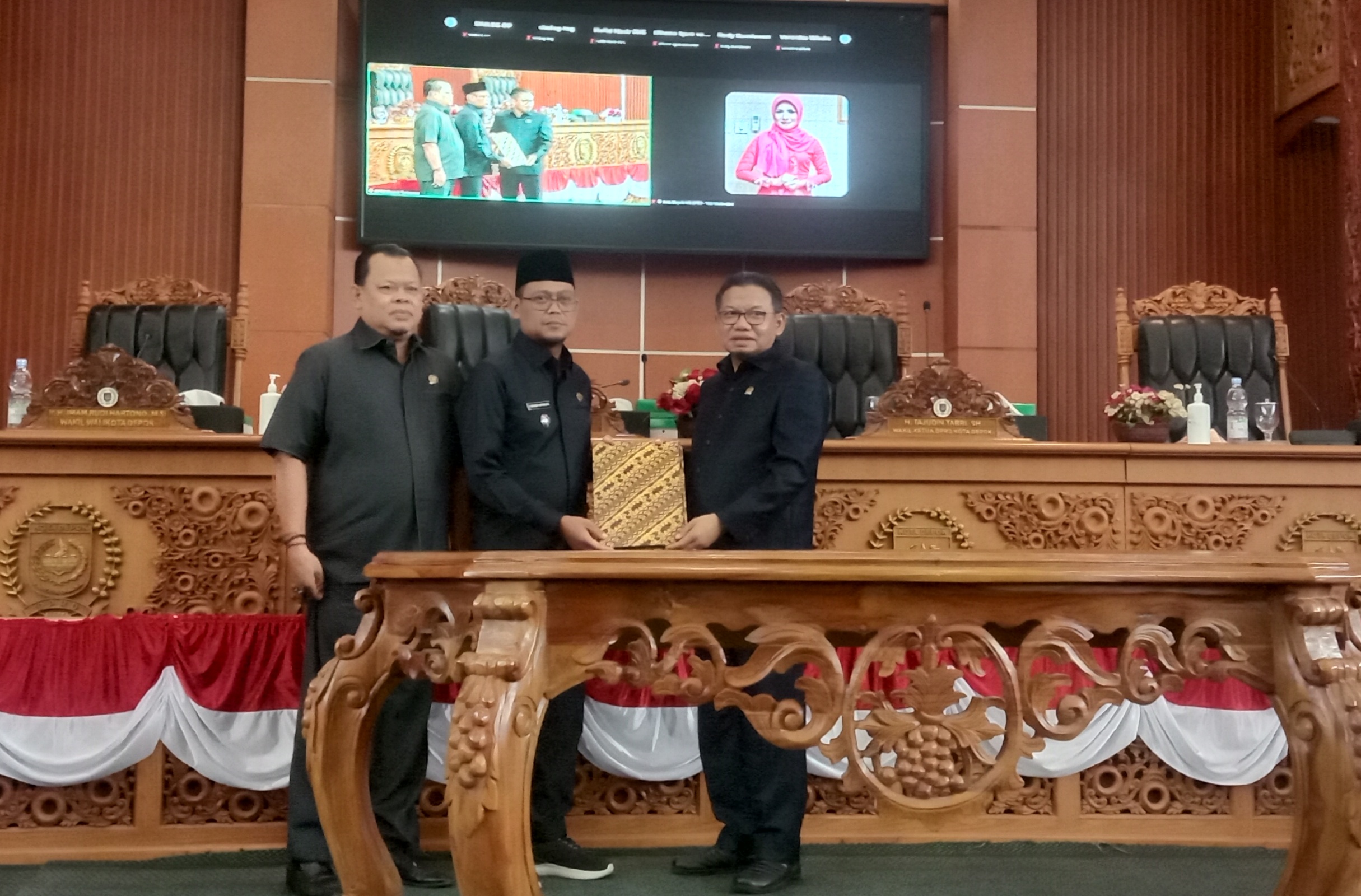 Rapat paripurna dihadiri oleh Wakil Wali Kota Depok Imam Budi Hartono, Ketua DPRD Kota Depok TM. Yusufsyah Putra, Wakapolres Metro Depok, perwakilan Dandim 05/08 Depok, perwakilan Kejaksaan Negeri Kota Depok, Pengadilan Agama Kota Depok, dan Imigrasi Kota Depok. (el’s)