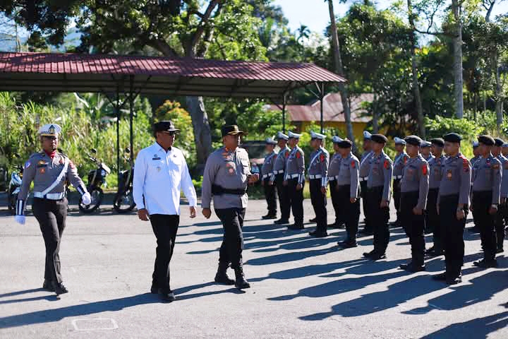 Terlihat Bupati Madina didampingi Kapolres Mandailing Natal, AKBP. Arie Sofandi Paloh, S.H, S.IK memeriksa kesiapan pasukan yang mengikuti apel Operasi Lilin Toba 2024.