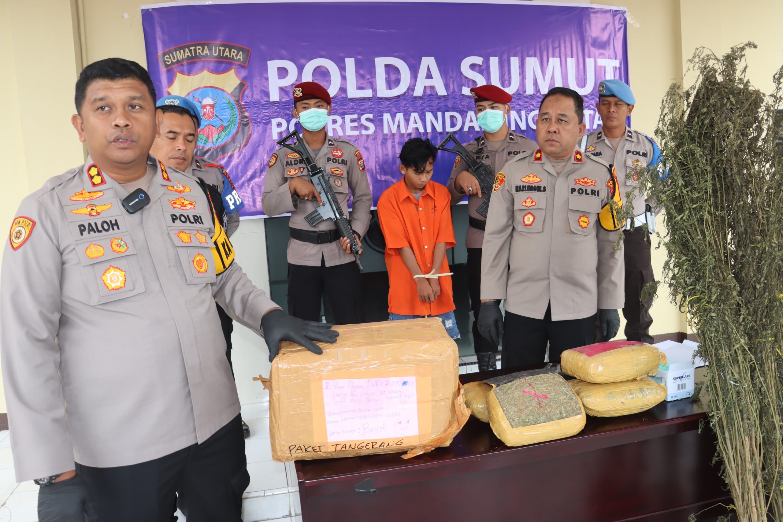 Kurir ganja itu berinisial PH (22), warga Kelurahan Kotasiantar, Kecamatan Panyabungan dan barang bukti 5,3 Kilogram (Kg) daun ganja dibungkus lakban lima paket di dalam kardus berhasil disita di loket bus tersebut.