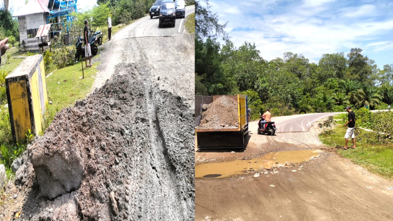 Mandailing Natal, | Sketsa Online.com – Pengguna jalan yang melintasi Natal – Batahan, tepatnya di batas Desa Pardamean Baru melakukan perbaikan jalan di Jembatan Langgune dengan cara menimbun dan memadatkan jalan tersebut.