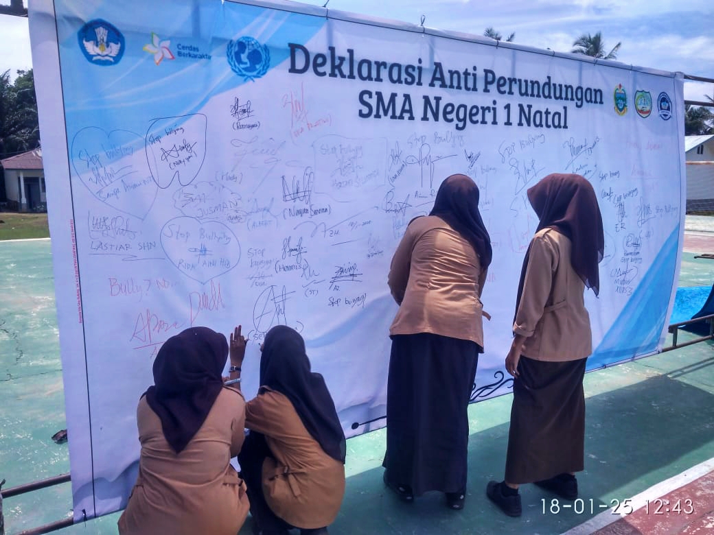 Kepala SMAN 1 Natal, Muhammad Arif Lubis, S.Pd melalui Wakil Kepala Sekolah (Wakasek) Bidang Kurikulum, Saripa Ariani Nasution, S.Pd pada sambutannya mengharapkan kegiatan tersebut tidak sekedar seremonial, namun para agen perubahan mampu mengaplikasikan anti perundungan di lingkungan sekolah.