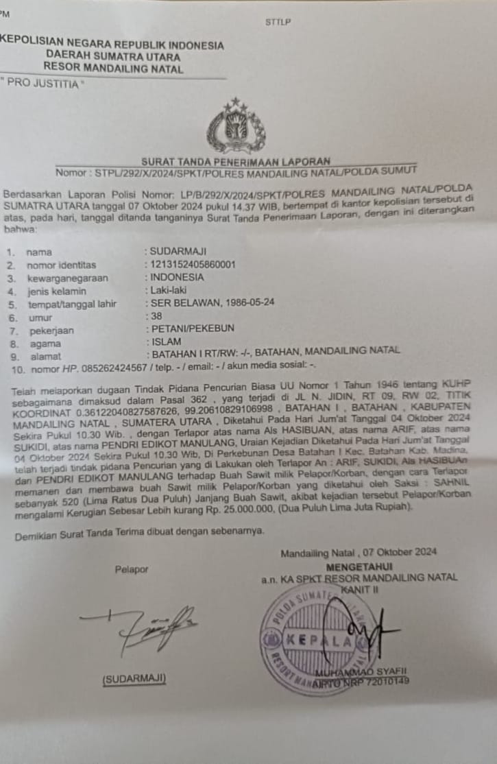 “Laporan saya telah diterima oleh a.n. KA SPKT Resor Mandailing Natal Kanit II Muhammad Syafii ditandatangani, Mandailing Natal , 07 Oktober 2024