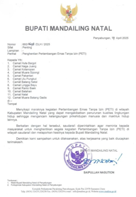 Dalam surat tersebut, H. Saipullah Nasution selaku Bupati Mandailing Natal memerintahkan terhadap 12 Camat diantaranya, Camat Huta Bargot, Camat Naga Juang, Camat Kotanopan, Camat Muara Sipongi, Camat Pakantan, Camat Ulu Pungkut, Camat Batang Natal, Camat Lingga Bayu, Camat Batahan, Camat Ranto Baek, Camat Natal, Camat Muara Batang Gadis agar meminta kepada masyarakat untuk menghentikan segala kegiatan Pertambangan Emas Tanpa Izin (PETI) diwilayah kerja masing-masing sang Camat.